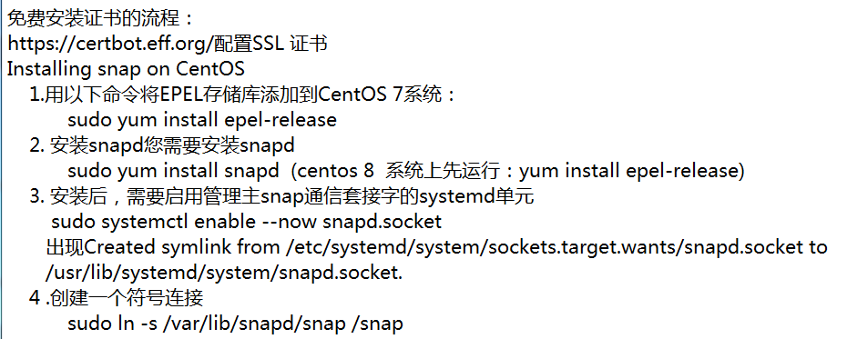 三,Install Certbot ------- 如果您使用诸如apt、dnf或yum等OS包管理器安装了任何Certbot包, 则在安装Certbot快照之前,应将其删除,以确保运行命令Certbot时, 快照使用的不是从OS包管理器安装。执行此操作的确切命令取决于您的操作系统,但常见的示例是:1,sudo apt get remove certbt、 2,sudo dnf remove certbt 3,sudo yum remove certbt
