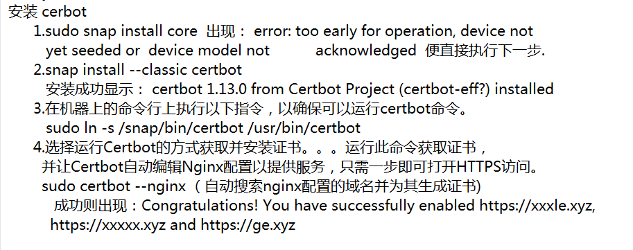 四, 安装 cerbot。 一.sudo snap install core 出现: error: too early for operation, device not yet seeded or device model not acknowledged 便直接执行下一步。 二.snap install --classic certbot 装成功显示:certbot 1.13.0 from Certbot Project (certbot-eff?) installed 3.在机器上的命令行上执行以下指令,以确保可以运行certbot命令。 sudo ln -s /snap/bin/certbot /usr/bin/certbot 4.选择运行Certbot的方式 获取并安装证书。。。运行此命令获取证书, 并让Certbot自动编辑Nginx配置以提供服务,只需一步即可打开HTTPS访问。