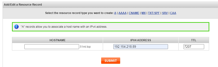 五,选择第5项蓝色球形图标出跳出如下页面点击A项,填写所购域名要指向的IP然后提交,稍微等15-30分钟,解析完成,可以在windows下用命令ping xxxx.com检查是否成功